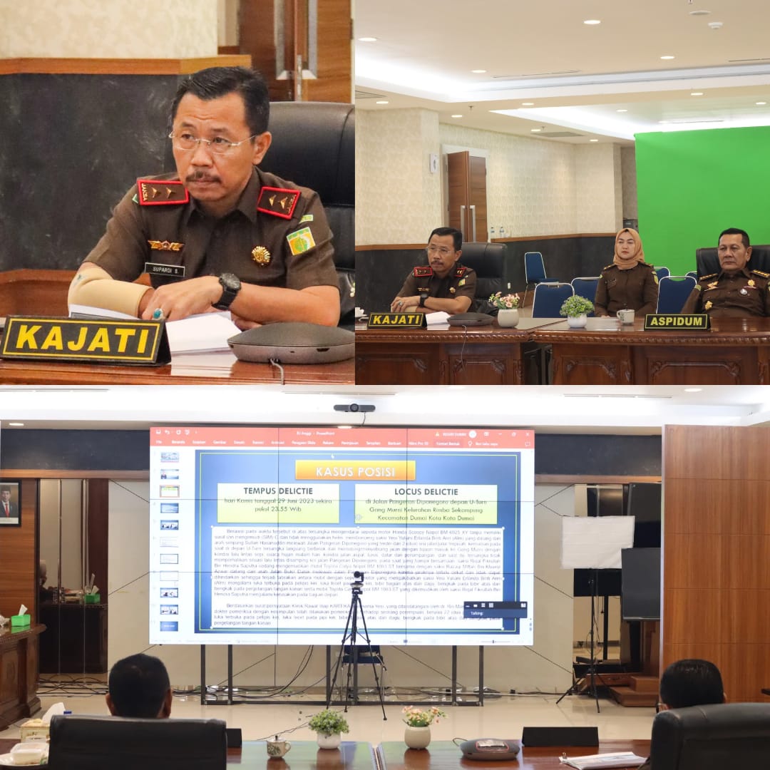 Pekanbaru – Kepala Kejaksaan Tinggi Riau Dr. Supardi didampingi Asisten Tindak Pidana Umum Kejaksaan Tinggi Riau Martinus Hasibuan, S.H menggelar Ekspose Perkara Penghentian Penuntutan berdasarkan Keadilan Restoratif bersama Direktur Tindak Pidana Orang dan Harta Benda (Oharda) Jaksa Agung Muda Pidana Umum Kejaksaan Agung Republik Indonesia dan Kejaksaan Negeri Dumai secara virtual.
