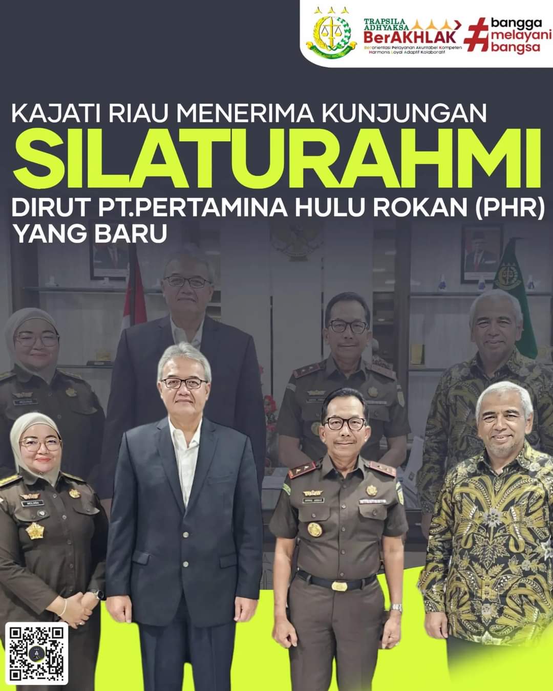 Pekanbaru -Kepala Kejaksaan Tinggi Riau Akmal Abbas, S.H., M.H didampingi Asisten Perdata dan Tata Usaha Negara Kejaksaan Tinggi Riau Meilinda, S.H., M.H menerima Kunjungan Kerja sekaligus silaturahmi Pimpinan PT. Pertamina Hulu Rokan Wilayah Kerja Rokan yakni Direktur Utama PT. Pertamina Hulu Rokan Wilayah Kerja Rokan Ruby Mulyawan didampingi Direktur Utama PT. Pertamina Hulu Energi (PHE), Sub Holding Upstream (SHU) Pertamina Chalid Said Salim yang sebelumnya menjabat sebagai Pimpinan PT. Pertamina Hulu Rokan Wilayah Kerja Rokan bertempat di Ruangan Rapat Kepala Kejaksaan Tinggi Riau Selasa Tanggal 20 Desember 2024 sekira pukul 16.00 Wib s/d selesai.